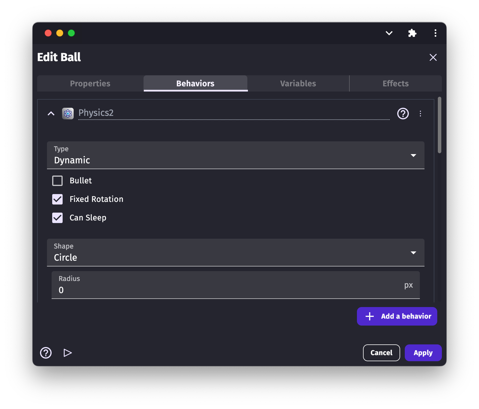 When you add the Physics behavior to an object, you can set the body configuration right from the IDE. There are many options to play with. They have been categorized below. .